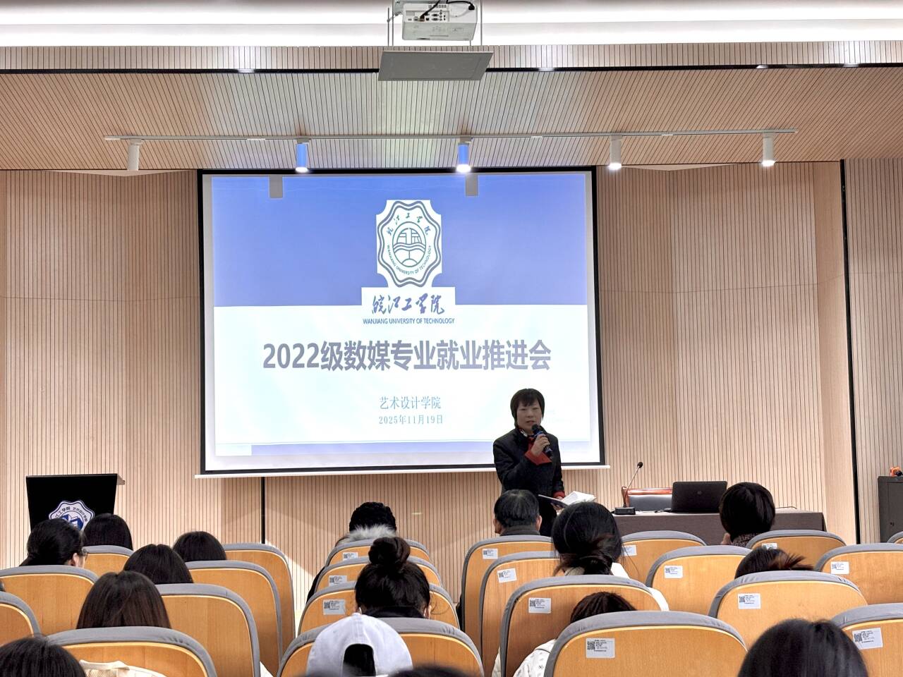 为扎实推进2026届毕业生就业工作,提升学生就业竞争力,11月19日,艺术设计学院在洪雅楼105报告厅组织召开2022级数字媒体艺术专业就业推进会。艺术设计学院院长伍旭坤、党总支书记张亚梅、副院长金花、副书记程楠楠、数媒专业教研室主任、副主任及22级辅导员共同参会,为即将步入就业岗位的学子提供精准就业指导。